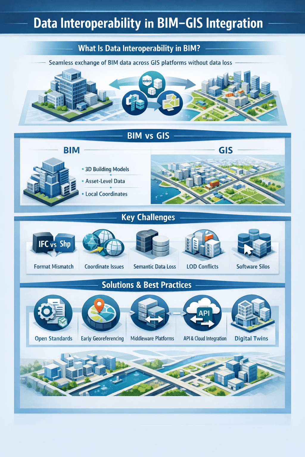 The main challenges of BIM–GIS data interoperability include incompatible data formats, coordinate system mismatches, semantic data loss, level of detail conflicts, and software platform silos. These issues often result in inaccurate models and inefficient data exchange.