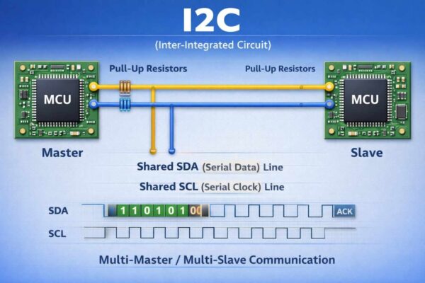 I2CWiredMedium (100 kbps–3.4 Mbps)LowShortLowEEPROM, RTC, multiple peripherals