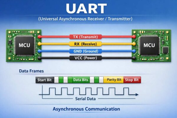 UART (Universal Asynchronous Receiver/Transmitter) is one of the most widely used communication protocols in embedded systems for serial data transmission between devices. It enables communication without requiring a shared clock signal, making it simple and efficient for short-distance communication.